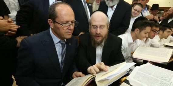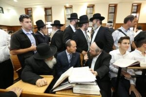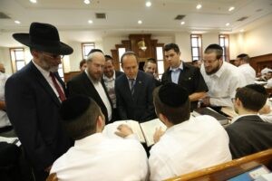 Barkat s’est ensuite assis à côté du Rav Nissan Kaplan, qui fait partie de la direction de la Yeshiva, afin de discuter avec lui d’une question abordée par le Talmud.