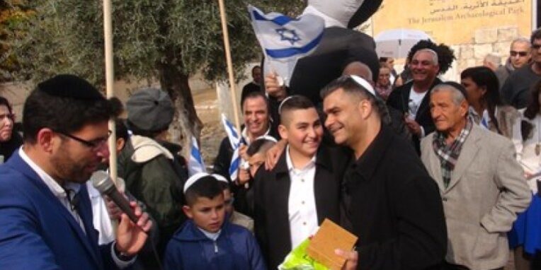 Au cours de la cérémonie, Itaï Betsalel, directeur général de la compagnie pour le développement du quartier juif de la Vieille Ville, a remis au jeune Naor un livre de prières de la Hourva, synagogue ancienne qui a été restaurée récemment dans le secteur. Photo Aroutz Sheva